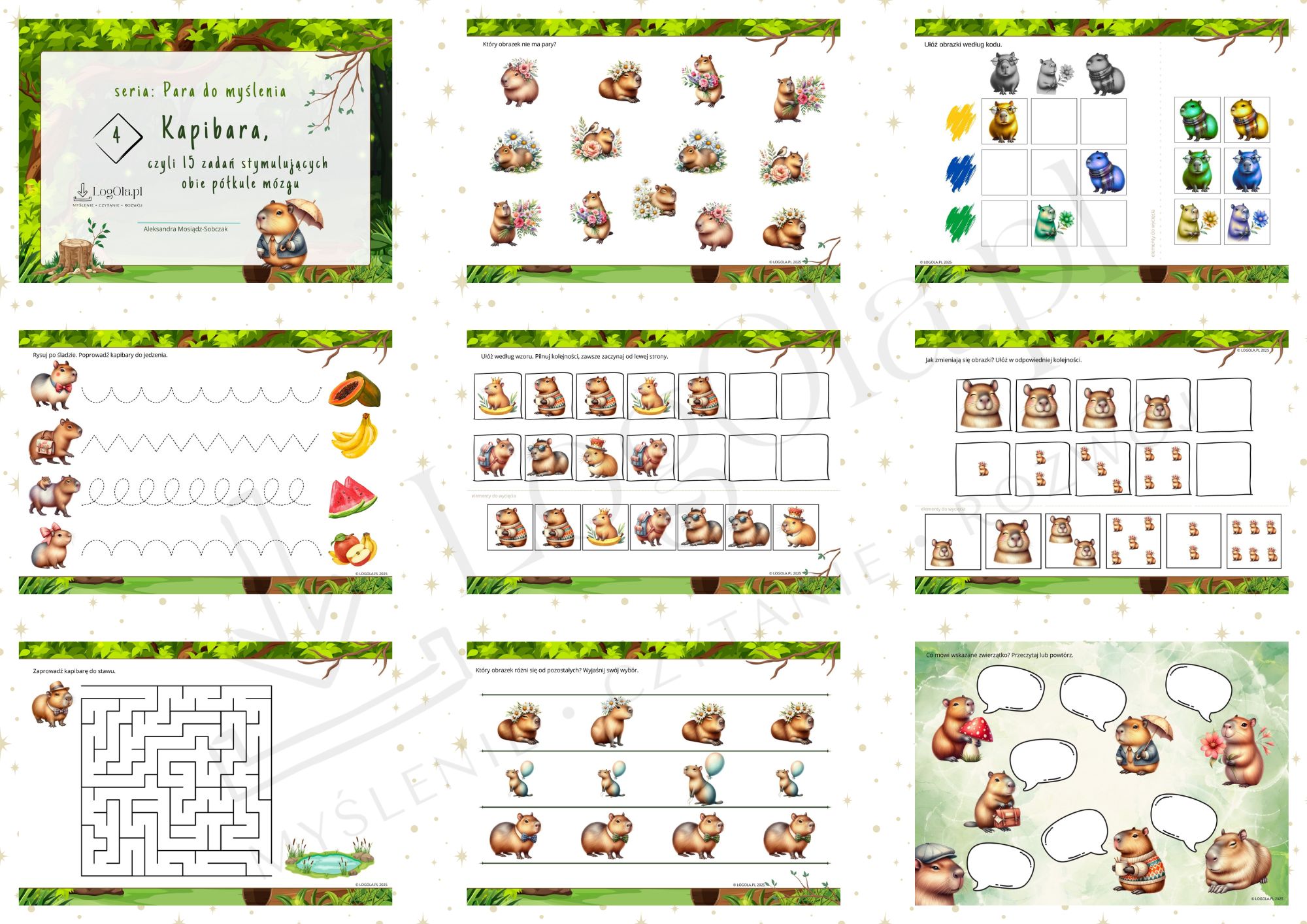 „Para do myślenia” to cykl gotowych zestawów zadań, które angażują obie półkule mózgu – logiczną i kreatywną. Każdy zestaw oparty jest na konkretnym temacie i zawiera ćwiczenia wspierające rozwój poznawczy dzieci. Idealne dla nauczycieli, logopedów i terapeutów – do wykorzystania na zajęciach indywidualnych i grupowych.